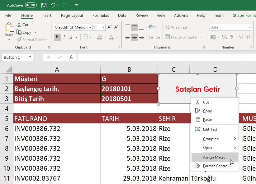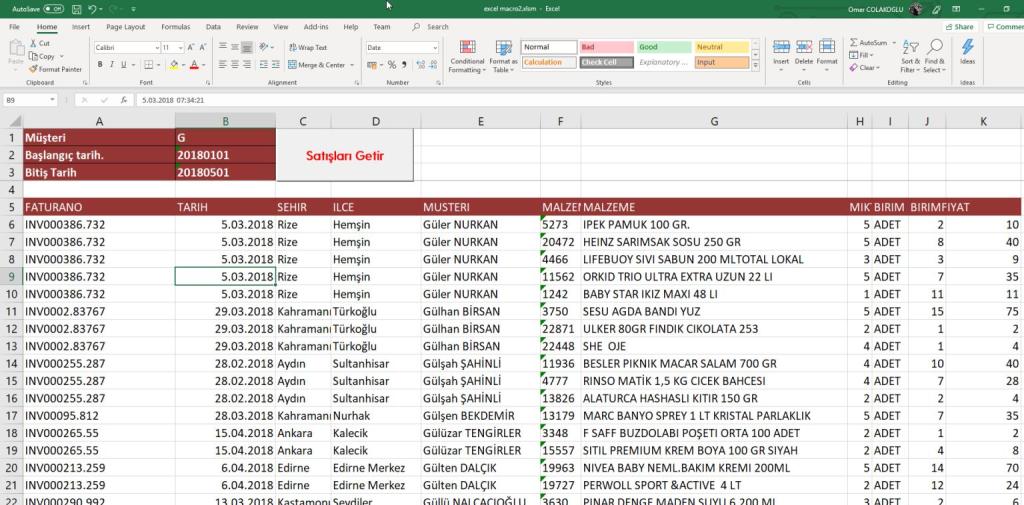 Örneğin burada Müşteri adı, başlangıç tarihi ve bitiş tarihi excel’den parametre olarak gönderiliyor ve karşılığında bu parametreler ile “SPSATISRAPOR” stored procedure ü çalıştırılıyor.
