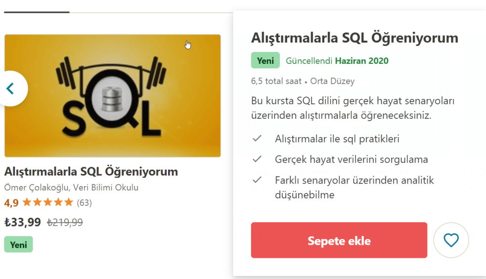 O zaman sürekli yeni senaryo, veri setleri ve sorularla güncellenen, 70’ten fazla çözümlü soru videolarıyla, yayınlanalı henüz bir ay olmasına rağmen 2.150 öğrencisi ve 4.9 değerlendirme puanı ile “Alıştırmalarla SQL Öğreniyorum” kursu tam sana göre. Bu link ile 24.99 TL’ye alabilirsin.