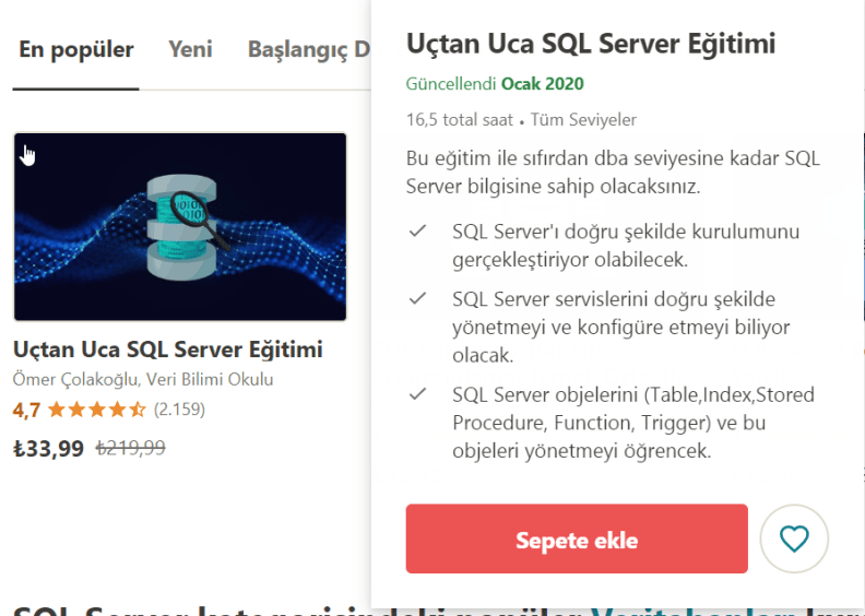 “SQL dilini öğrendim ama bu bana yetmez. Ben bir veritabanı sistemini yönetmeyi, büyük veri ile uğraşmayı, performans sorunlarına çözüm üretmeyi istiyorum. Bir Database Admin olmak istiyorum” diyorsan o zaman 11.800 öğrencisi ile ve 4.75 değerlendirme puanı ile “Uçtan Uca SQL Server” kursuna mutlaka gözatmalısın. Bu link ile 24.99 TL’ye alabilirsin.